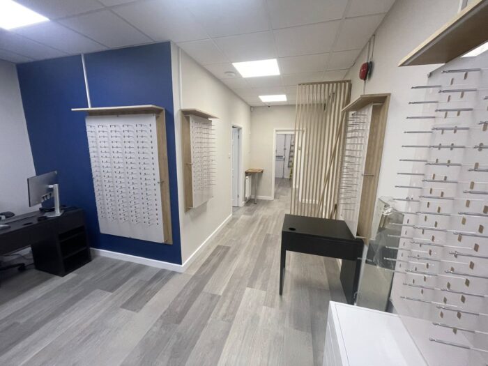 Gut out / build new appointment rooms / new display units / bespoke desks to maximise space / new Amitco flooring / painted / oak wall panelling / quick completion times. &